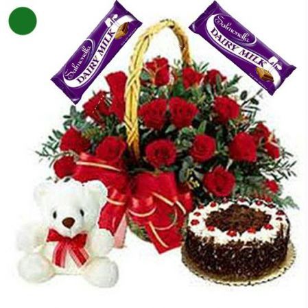 24 Exclusive Red Roses with round Cake , 2 * 65 g Cadburys Assorted Chocolates and a Cute 8" Teddy Bear.The gift is sure to fill the heart of the recipient with your thoughts. (We deliver only Freshly Baked Cakes.)