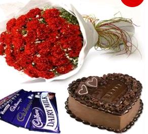 send your feelings, emotions, care, love to your dear one with this beautiful bunch of flowers, cake and Rose, by sending these amazing flowers, cake and chocolate, 12 red roses bunch and 1/2 kg. black forest cake,With 4 mix cad bury chocolate 40 grm each.