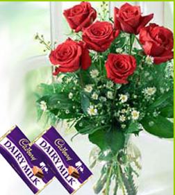 6pcs Roses & cadburyHaft dozen red roses in a vase w/ 2x75 grams. A nice gift when you fall in love with someone but don't know what to offer her.Your gift will come with a greeting card and your message |