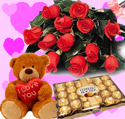 Cute SmileBunch of 12 Red Roses and 9 Inches Teddy Bear m I love you pillow and 24 Ferrero rocher. |