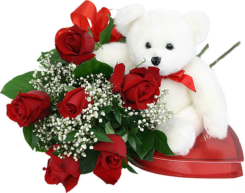 Love you forever6 roses bouquet with heart shape Hershey kisses and 9 inches teddy bear. |