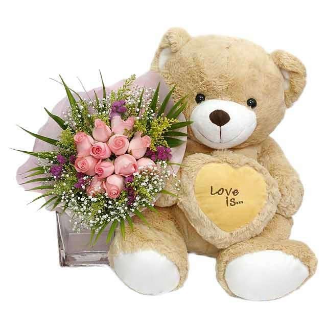 PEACHY INFATUATIONYoung and sweet, this sitting 24" light brown bear expresses newfound infatuation by arming himself with a bunch of 12 peach roses with love u pillow . pillow color may vary. |