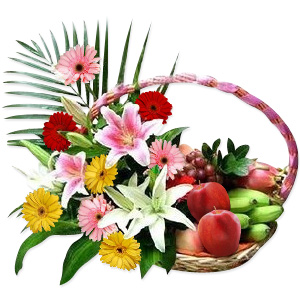Flowers & Fruit BasketFlowers fruits basket contains apples, grapes, bananas along with 1 pink lily, 1 white lily, gerberas, and greenery. 6 items fruits |