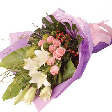 La VidaFlowers she will remember. Show her your appreciation with a grand floral bouquet of monstera leaves ,light pink or pastel pink roses, Berries and casa blanca lily. |