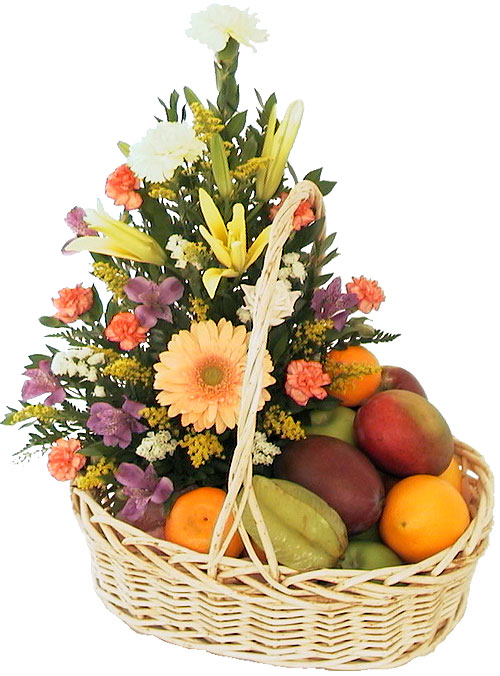 Especially For You...Description: pink snapdragons, yellow stargezer,oranges carnation .,with 6 item's fruits in a basket Your gift will come with a greeting card and your message . |
