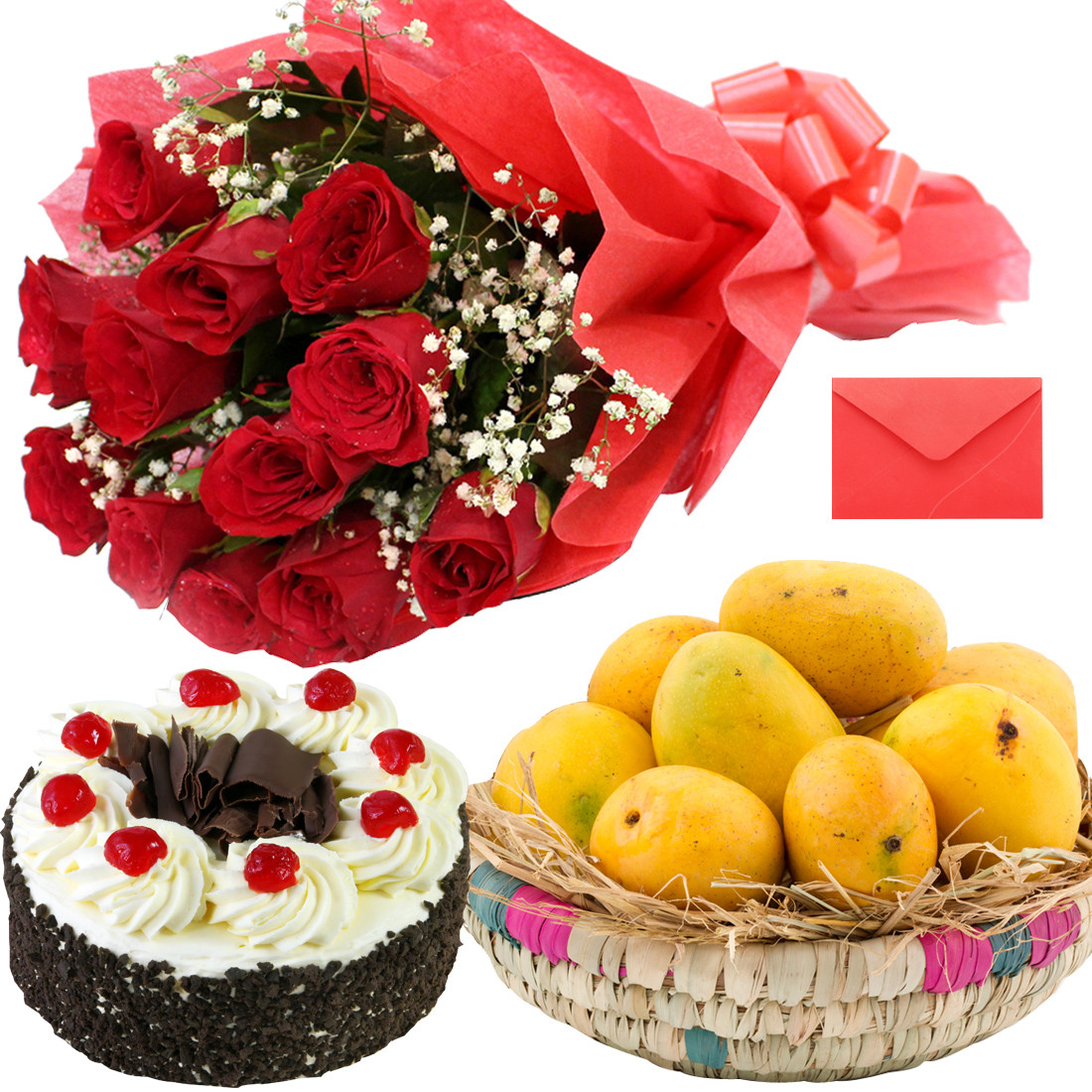 On The RangeDescription:Fruits Arrangement ( 10 mango) 12 red roses black forest N0TE: FRUITS ITEMS MAY VARY ..DEPEND ON TH AVAILABILITY |