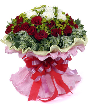 Endless Love9 white roses in the middle, 24 red roses outside. with full euphorbia marginata outside. Yellow and pink curling round paper packaging, red and pink color bowknot. Imagine your recipient's surprise when this beautiful roses in assorted pastel colors arrive at their doorstep! |