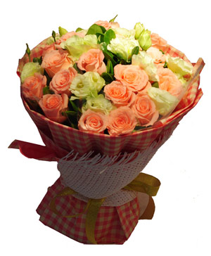 Honorable19 pink roses match eustoma grandiflorum (or white roses) and green, hand-tied bouquet. |