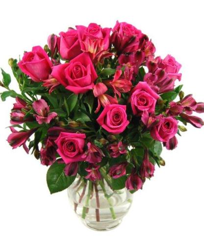 HOT PINKA bouquet in hot pink, featuring pink roses and alstromelias. Vase is not included. |