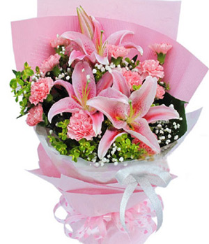 Sunshine & Sweetness2 pink perfume lilies, 11 pink carnations, baby's breath and foliages. Pink crepe paper, glass paper fan-shaped packed and pink ribbon. |