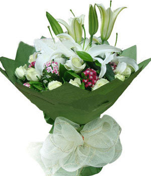 The Happy Union16 white roses, 2 stalks white perfume lilies with small floral such as gypsophila, forget-me-not. White gauze wrapped. |