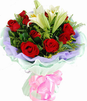 The Most Beautiful11 premium red roses, 1 stalk easter lily and match foliages and small flowers. Lilac colour cotton paper and green crepe paper round packed. Please note may substitute easter lily for white lily depending upon availability in certain regions. |