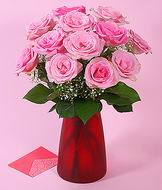 Wish your friend/ loved one a bright day with this beautiful 12 pink roses in a glass vase.