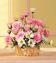 Pink BasketBasket arrangement with 12 pink roses, pink mini carnations, and hot pink carnations is complemented by some white seasonal flower. Designed in a handled basket. |