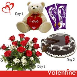 Day 1. TWO feet tall Teddy Bear holding a heart with 2 Cadbury Dairy Milk Chocolates 65 gm each.( Dely on 12th Feb) Day 2. Mouth watering chocolate cake -500gm. ( Dely on 13 th Feb ) Day 3. Bunch of 12 Red Roses for your sweet heart. ( Dely on 14th Feb. ) Please note : Cake design n looks may vary depending upon local availability